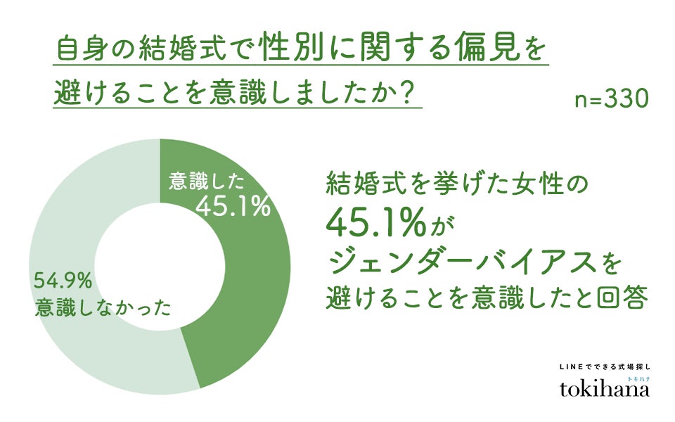 ・結婚式を挙げた女性の45.1%が自身の結婚式において性別に関する偏見(ジェンダーバイアス)を避けることを意識したと回答。