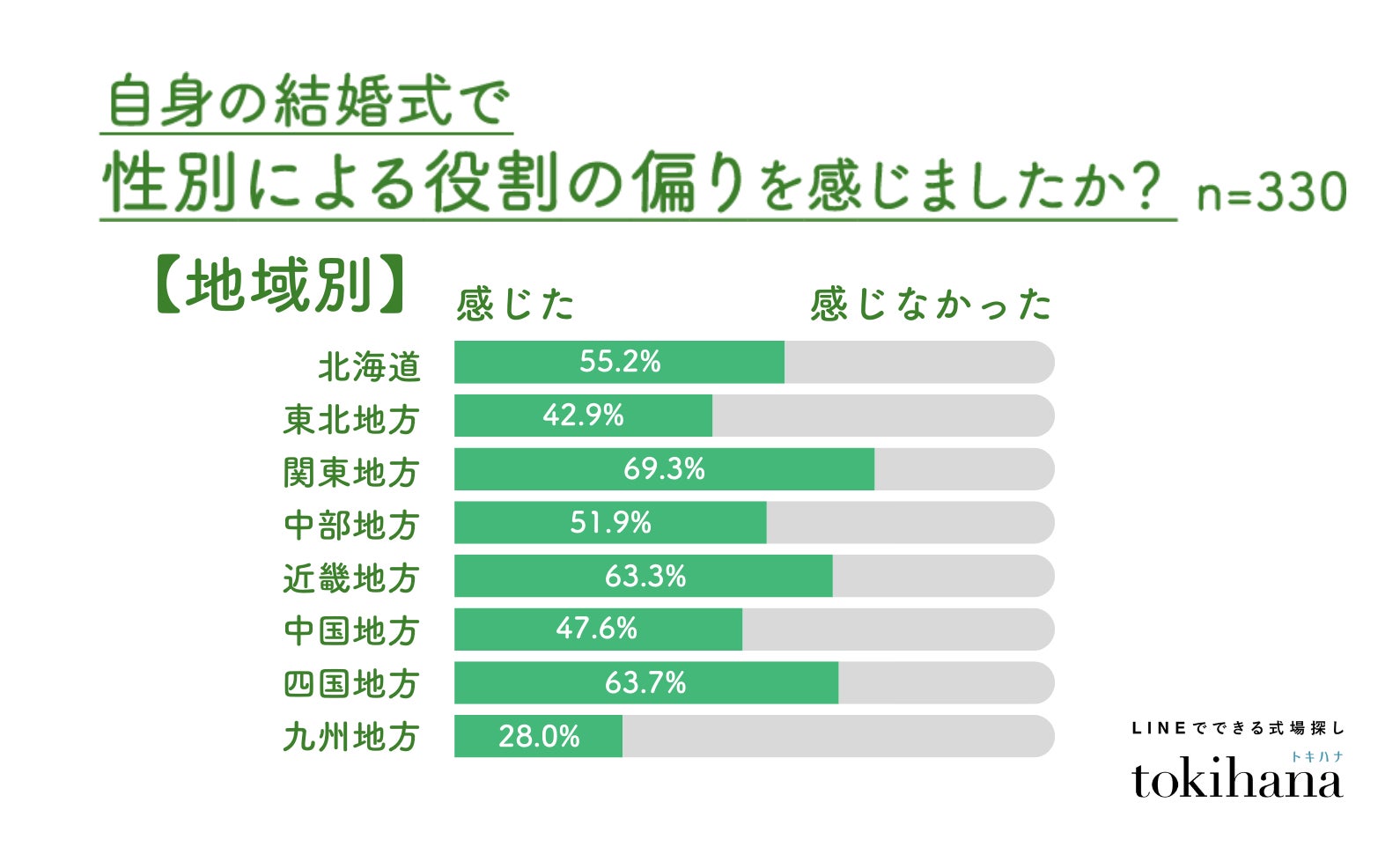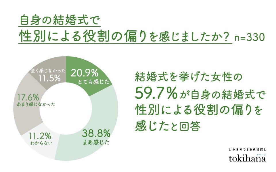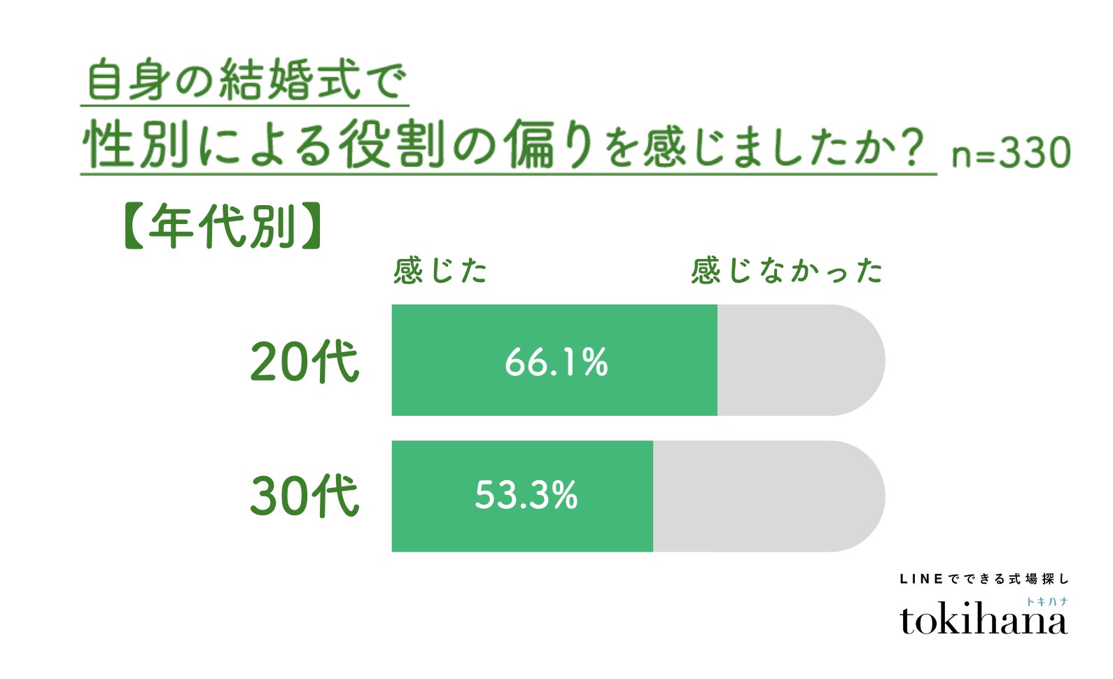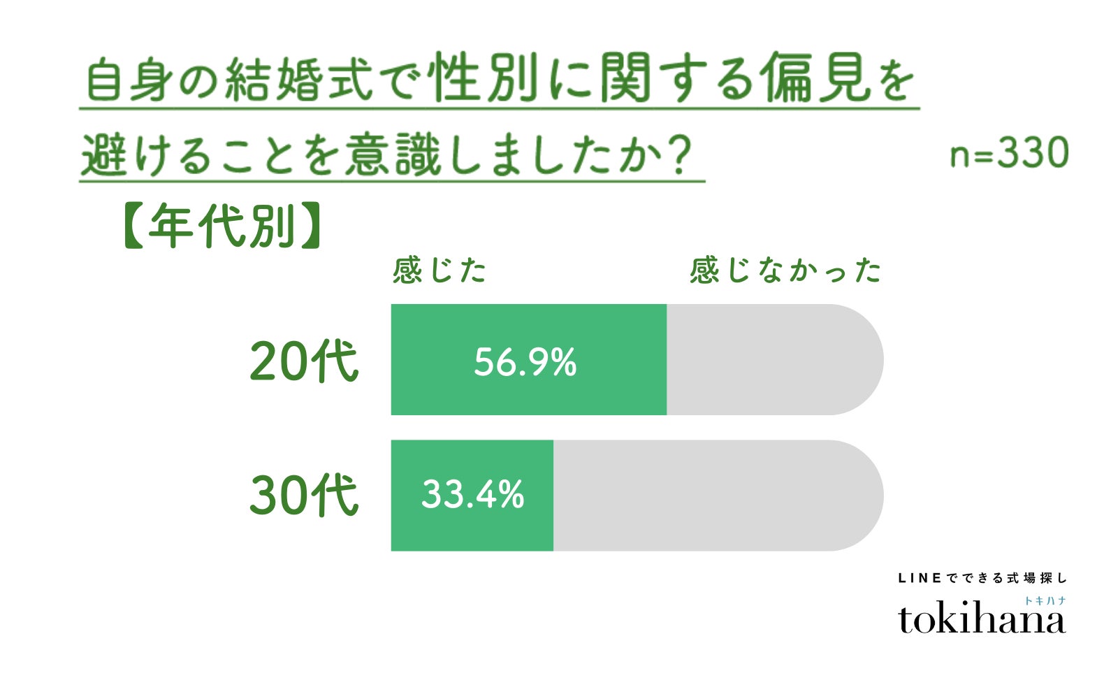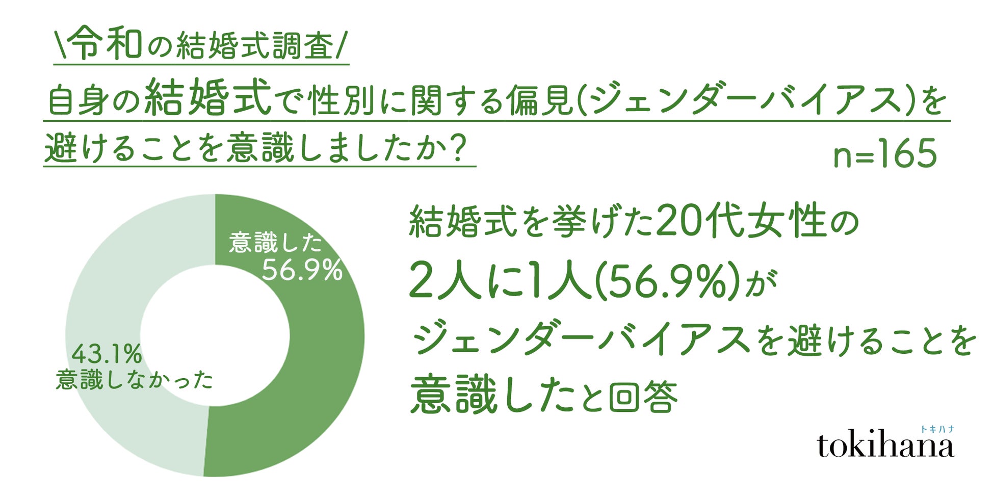 LINEでできる式場探し『トキハナ( https://tokihana.net/ )』を運営する株式会社トキハナ(本社:東京都港区、代表取締役社長:安藤正樹、以下「トキハナ」)は、インターネットリサーチで結婚式を挙げた20代〜30代女性の330人に向けたサンプリング調査の結果、20代の56.9%が【結婚式で性別に関する偏見(ジェンダーバイアス)を避けることを意識した】と回答し、結婚式の在り方に対する価値観の変化が明らかになりました。