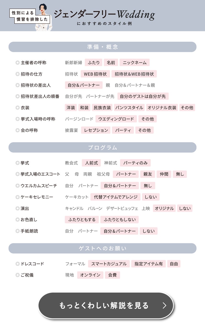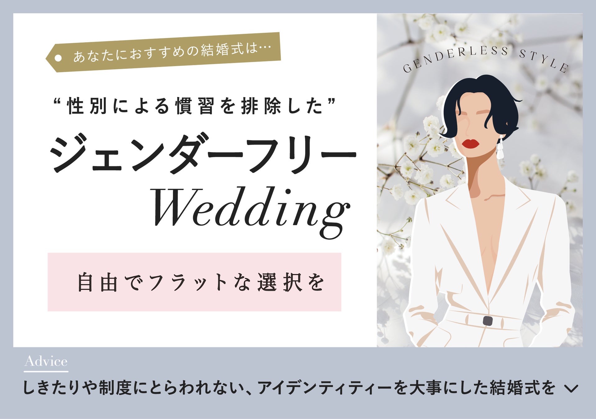 コンセプト診断では、7つのスタイルの中の1つに性別による慣習を排除した『ジェンダーフリーウエディング』のスタイルをご用意。しきたりや制度にとらわれない、アイデンティティを大事にした結婚式の内容がわかります。