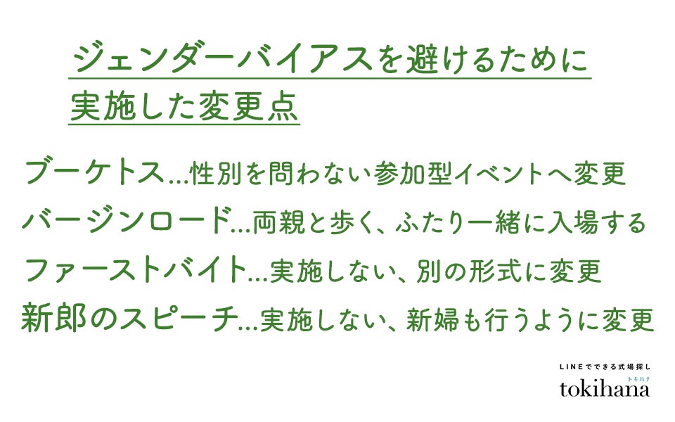「ジェンダーバイアスを避けるための演出の変更」に積極的に取り組むカップルが増えており、伝統にとらわれず自由な選択をする傾向が強まっていることがわかりました。
