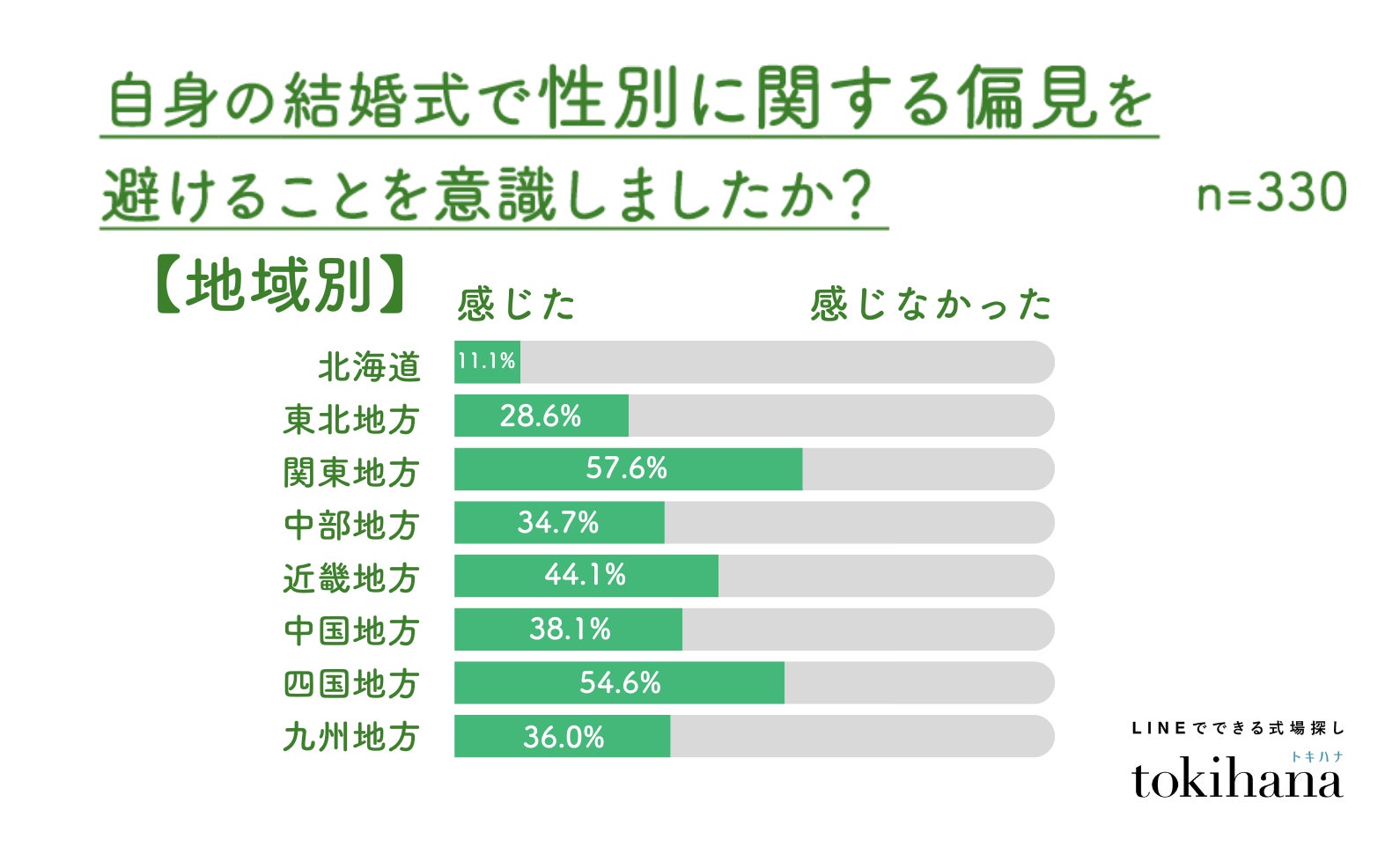 ・自身の結婚式でジェンダーバイアスを意識した人の割合が関東では過半数を占めるなど、都市部と地方で意識に差があることがわかりました。