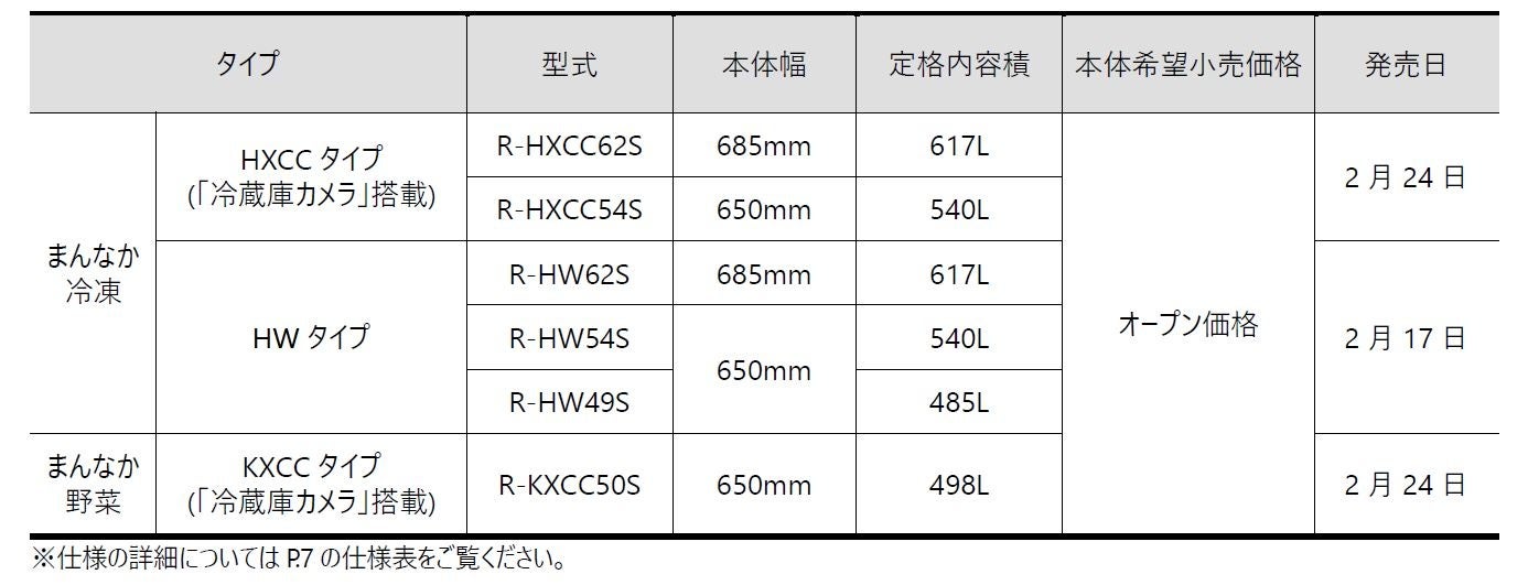 またラインアップとして、HXCCタイプと同様に置き場所に合わせて選べる大容量冷蔵庫で、へアライン調の鋼板ドアを新採用しインテリアになじみやすいフラットなデザインとした「まんなか冷凍 HWタイプ」3機種(定格内容積617L、540L、485L)を2月17日に、「冷蔵庫カメラ」を新搭載した「まんなか野菜 KXCCタイプ」1機種(定格内容積498L)を2月24日にそれぞれ発売します。