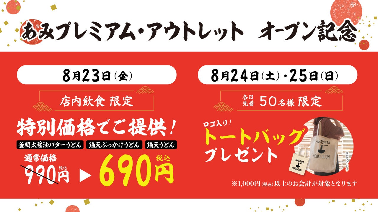 8月23日(金)は、山下本気うどんの定番メニューである、「釜明太醬油バターうどん」「鶏天ぶっかけうどん」「鶏天うどん」を、税込690円という特別価格でご提供いたします※1。8月24日(土)、8月25日(日)には、各日先着50名様へ山下本気うどんのロゴ入りトートバッグをプレゼントいたします。