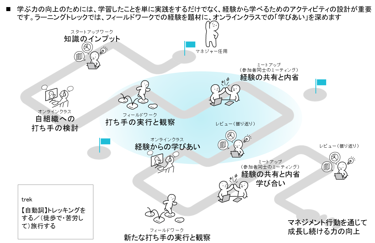・WEB学習、集合研修、フィールドワーク、参加者同士の学び合いなど、さまざまな学習形態を一定期間に複数経験することで、マネジメントを多面的に学ぶことができます。