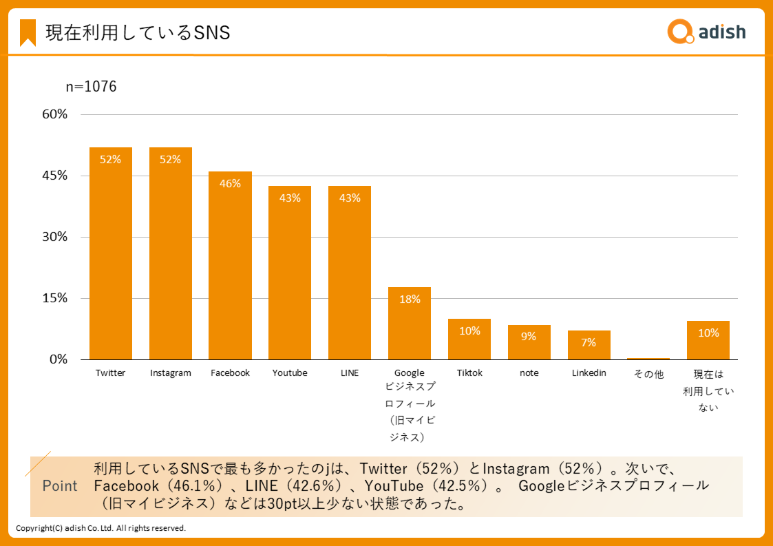 最も多く利用しているSNSは、TwitterとInstagram(共に52.0%)だった。次にFacebook(46.1%)で、Youtube(42.5%)とLINE(42.6%)はほぼ差がない利用率であった。一方、ビジネスオーナー向けの情報管理ツールであるGoogleビジネスプロフィール(旧Googleマイビジネス)は18.0%と、他のSNSと比べて利用率が少ない結果となった。
