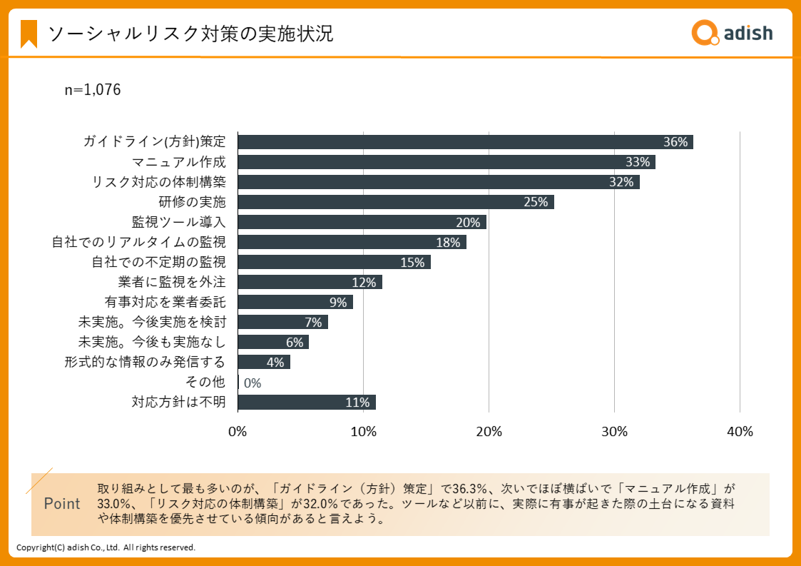 ・ソーシャルリスク対策の実施状況のトップは「ガイドライン(方針)の策定」で約36%