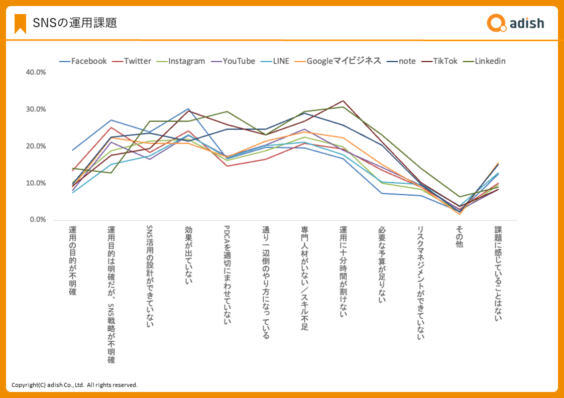 ・各SNS運用における多い課題は「効果が出ていない」や「専門人材がいない / スキル不足」