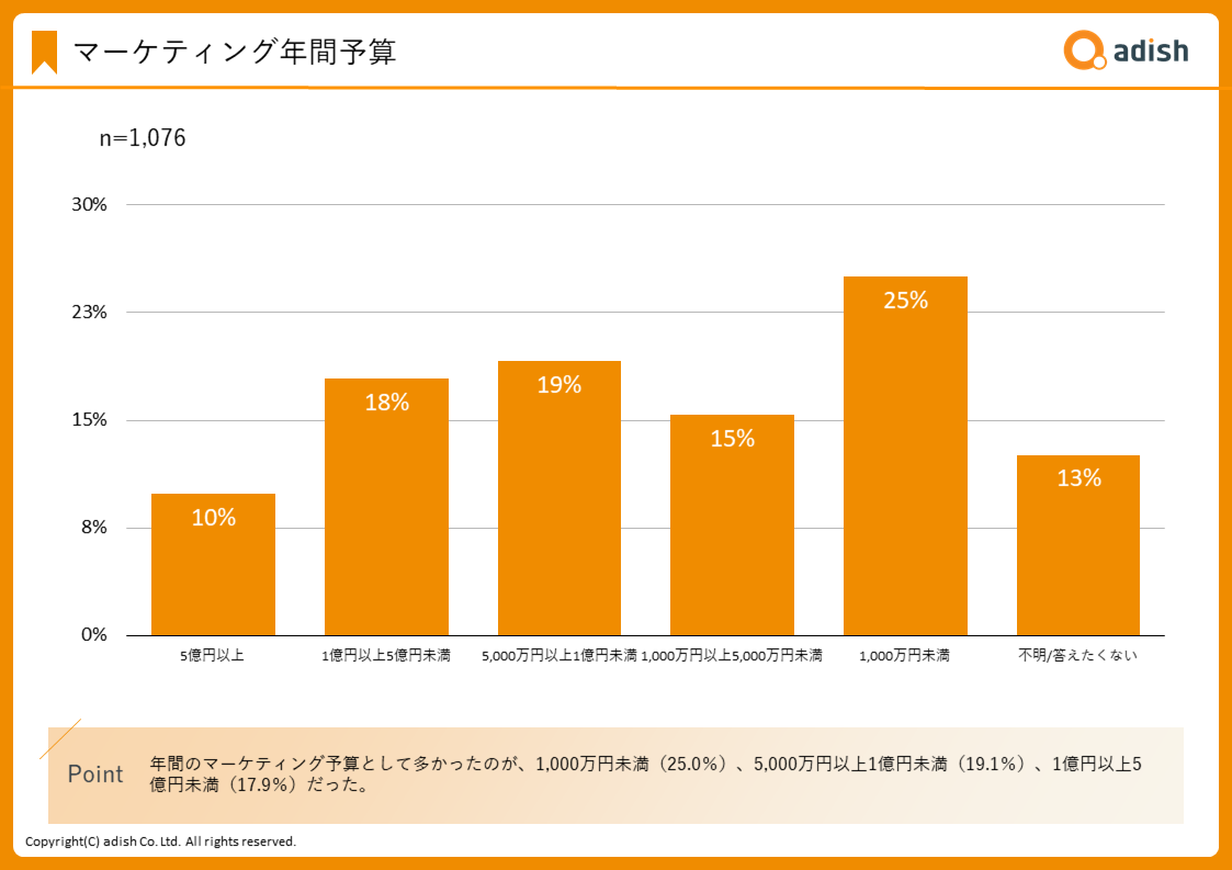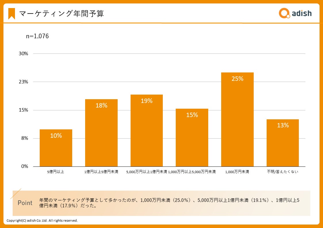 年間のマーケティング予算は、1,000万円未満(25%)が一番多い結果となった。一方で、1,000万円以上の予算があるのは約62%、そのうち1億円以上の予算があると回答した企業は28%に及んだ。