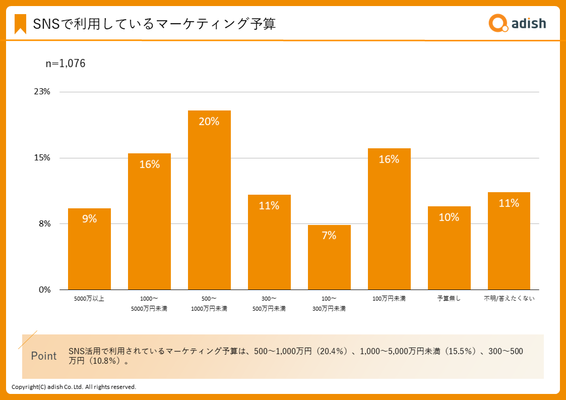そのうちSNSで利用している予算は、500万~1,000万円(約20%)が一番多い結果となった。全体でみると1,000万円以上は約25%、1,000万円以下は約64%だった。中でもSNSの予算がないと回答した企業は約10%いた。