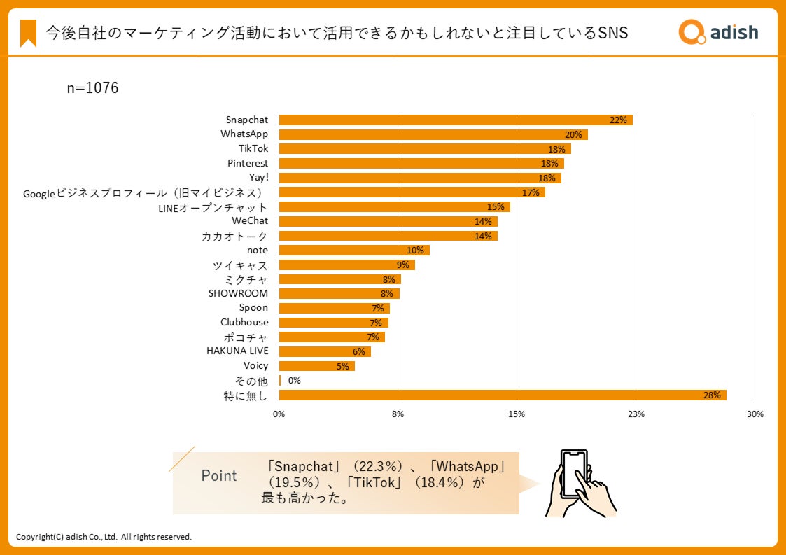今後、マーケティング活動で注目しているSNSの1位は、写真共有アプリのSnapchat(約22%)、2位がWhatsApp(約20%)、3位にTikTok(約18%)と続いた。