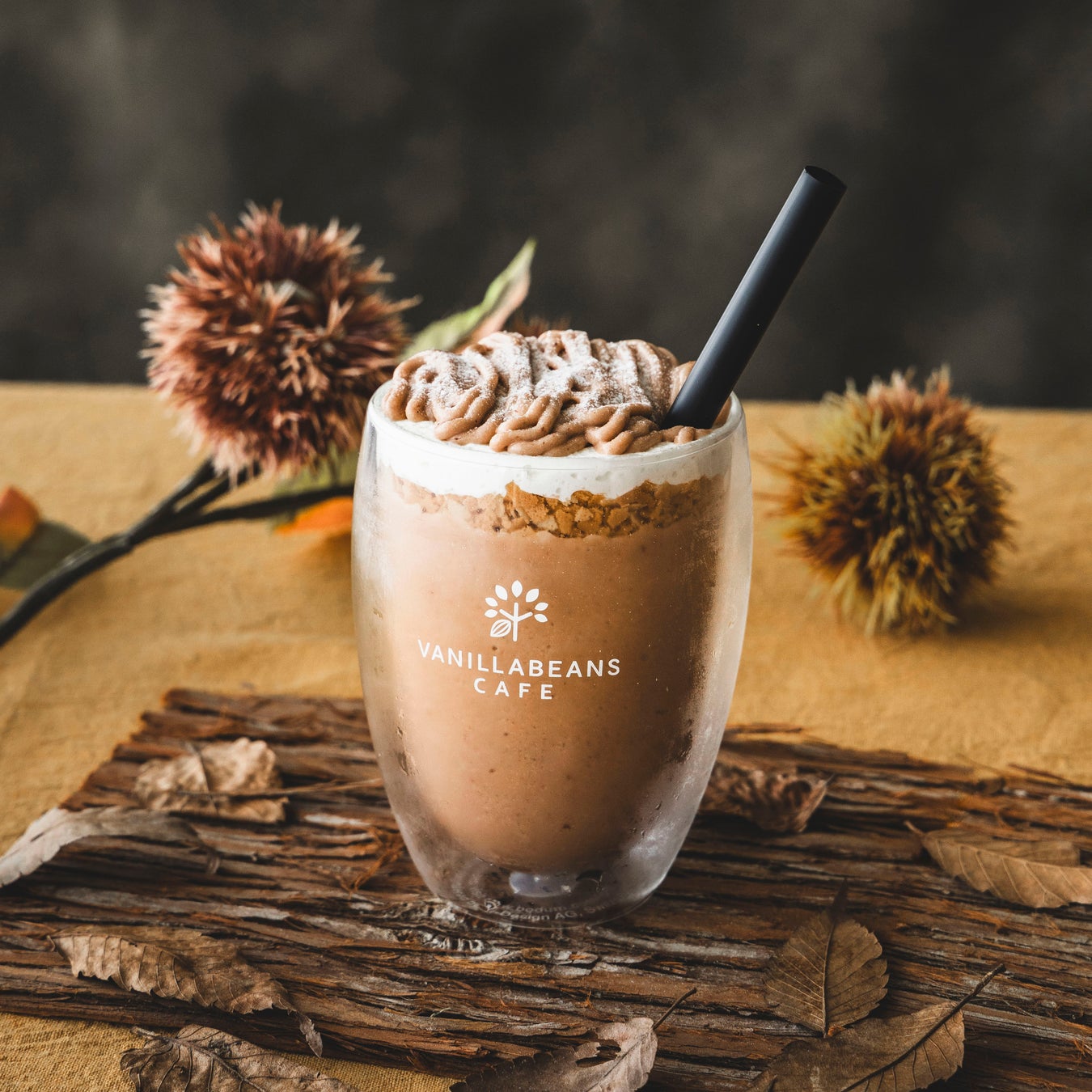 栗をたっぷりと使用したVANILLABEANSオリジナルのフローズン・チョコレートドリンク。ガーナ産とエクアドル産の自家製チョコレートに、濃厚なマロンクリームをブレンドしました。ご注文ごとに渋皮栗をまるごと1粒ミキシングして、一杯ずつ丁寧にお作りしています。仕上げには、さくさく食感のフィアンティーヌ(薄く砕いたクレープ生地)を忍ばせ、なめらかなモンブランクリームを贅沢に絞りました。デザートスプーンですくいながら、栗とチョコレートの絶妙なハーモニーをお楽しみください。