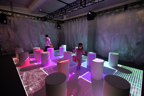 部屋の中にある人やモノの位置情報によって音や光が変化するリズムアトラクション