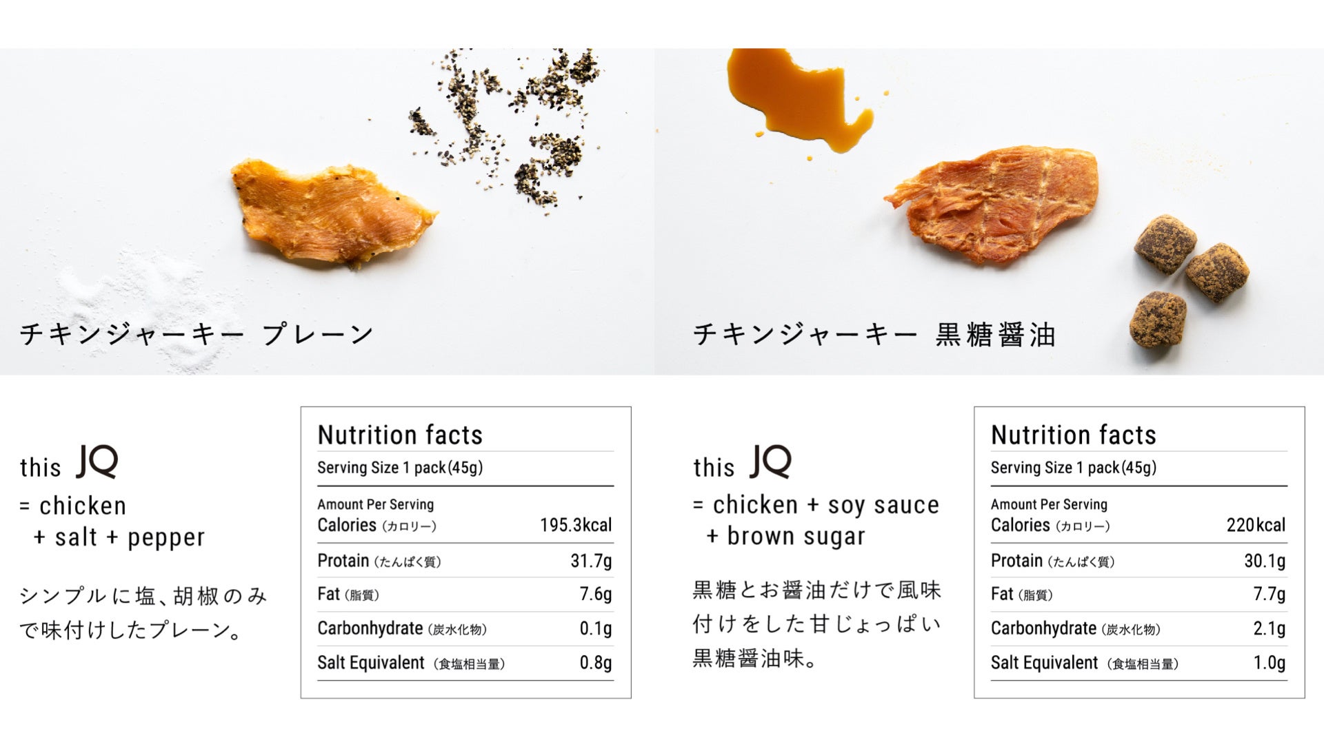 お肉とわずかな調味料のみで作る「JQ(ジェイキュー)」。お肉本来のシンプルなおいしさを活かすだけではなく、良質な栄養も補えるジャーキーを目指して開発しました。砂糖、代用油脂、増粘剤は一切使わず、シンプルなお肉本来の味わいをお楽しみいただけます。お肉が本来持つ良質な脂のみで作っているので、通常のジャーキーとは違う“サクサク食感”が特長です。スポーツ前後の栄養補給、オフィスでの仕事の合間の間食、外出先での小腹満たしにご活用ください。人気の2フレーバー(プレーン・黒糖醤油)を展開します。