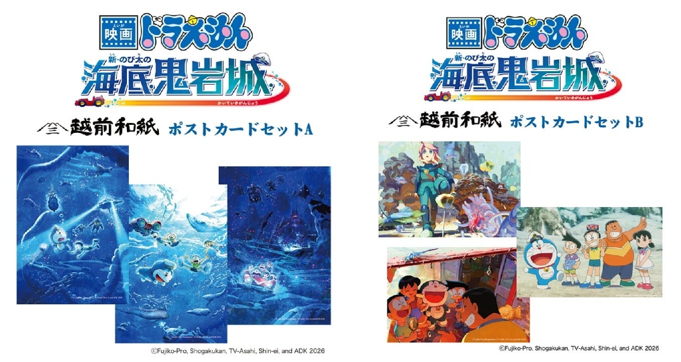 映画のエンディングに登場するイラストである「ジャイアンの家」「見上げるエル」「野比家の団らん」「農作業手伝い」や、作中でのび太たちが海底キャンプの記念に撮った「集合写真」、深海の冒険を表現した3連ビジュアル「海底探検A/B/C」の全8種をご用意。