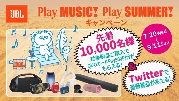JBL対象商品の購入で先着10,000名様にQUOカードPay500円分をプレゼント「Play MUSIC!Play SUMMER!キャンペーン」を開催中!