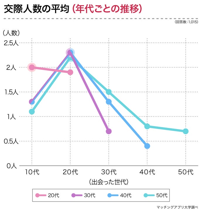 | ・40代以降は交際人数が減る傾向 ・「社会人になったとき」「30代後半」に出会いが減少 ・出会いを求めて行動したほうが3倍近くも恋人ができる確率が高い ・出会うために取った行動1位は「マッチングアプリ」 ・実際に交際相手に出会えたのも「マッチングアプリ」が1位 |