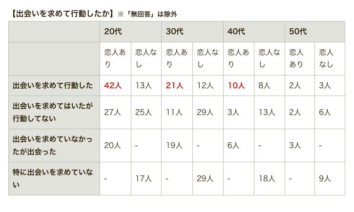 最初に「出会いを求めて行動した」という回答について“恋人がいる人”と“恋人がいない人”を比較してみると、20代から40代まではいずれも“恋人がいる人”のほうが多い結果でした。