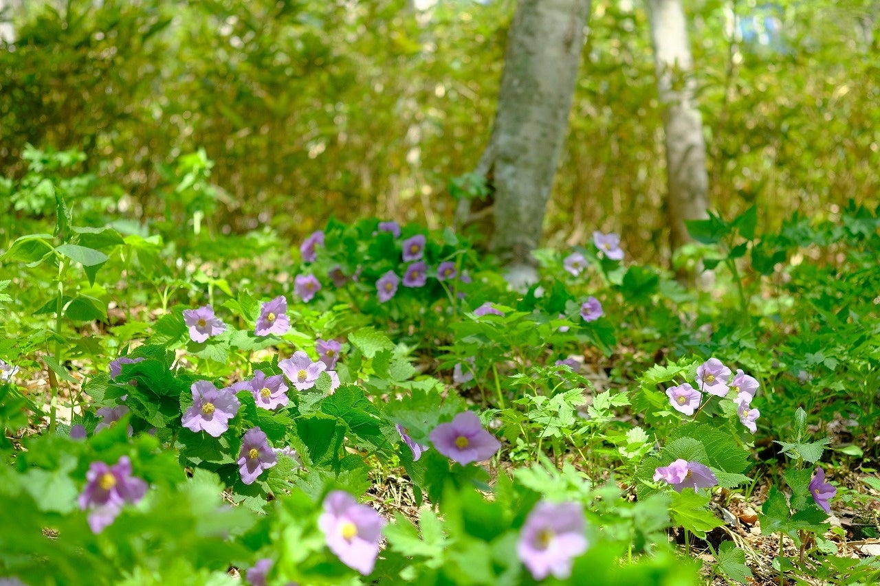 森の情報館から徒歩10分ほどのところにある「シラネアオイの小径」では毎年500本以上の花が見られ、エリア全体で1,500本ほどの花を見ることができます。