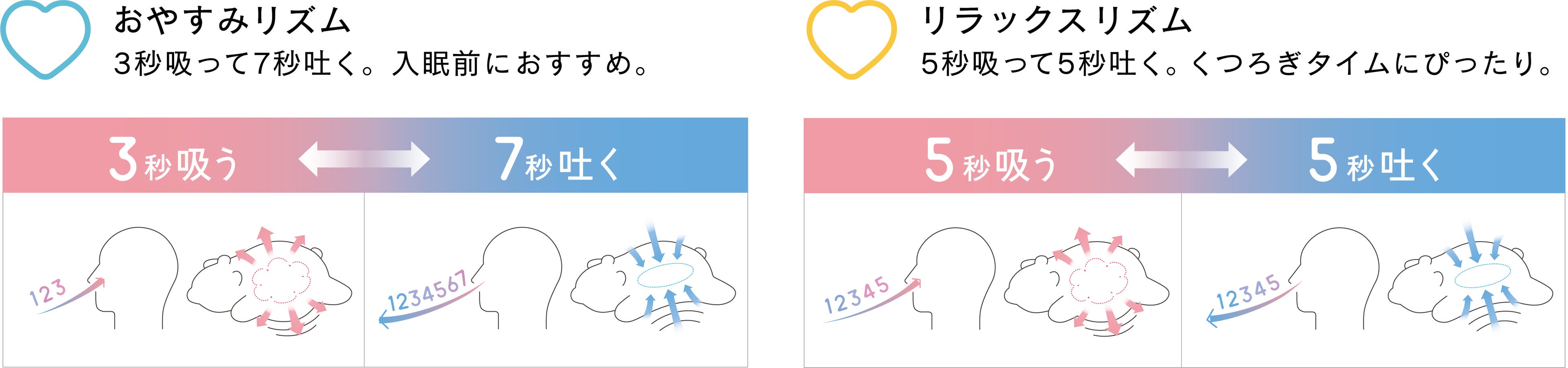 2つの呼吸リズムを内蔵。3秒吸って7秒吐く「おやすみリズム」は入眠前に、仕事の合間のくつろぎタイムには5秒吸って5秒吐く「リラックスリズム」を。シーンに合わせて呼吸のリズムをガイドします。