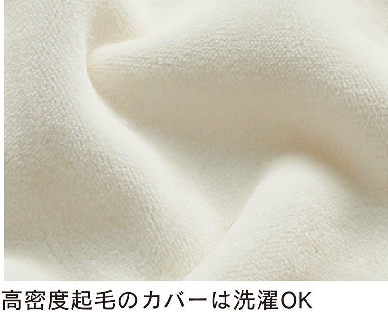 コンセントの位置などを気にせず使えるリチウムイオン充電池を搭載しています。充電を忘れた時は付属のACアダプターでも使える2WAY電源仕様。約20分の自動オフタイマー付きで眠ってしまっても心配いりません。カバーは、肌触りを追求した高密度の起毛素材で、手洗いOK。いつでも清潔に使えます。