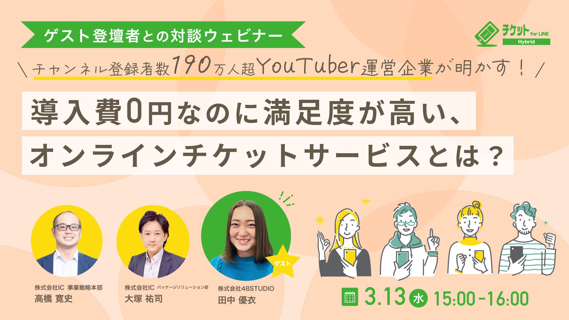 3/13(水)【無料 対談ウェビナー】高コスパで使いやすい!人気YouTuberの運営企業が明かす!導入費用0円なのに満足度が高い、オンラインチケットサービスとは?