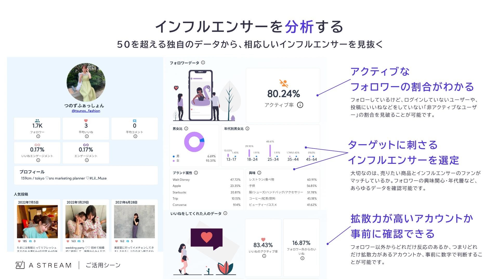 Astreamはこれまで取得不可能であった、インフルエンサーのフォロワーの”興味関心”や”ブランドの好み”といったサイコグラフィック情報の分析を可能にする、次世代SNSマーケティングツールです。