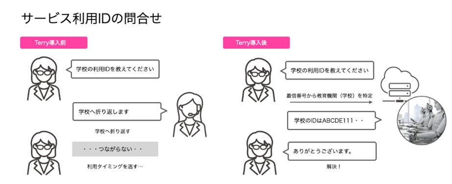 学校向け教育事業(ベネッセハイスクールオンラインサービス)では、ご利用頂く教育機関(学校)からの利用IDの問い合わせへの電話受付業務において、教育機関(学校)と複数回のやり取りを要するなど迅速な対応に課題がありました。教育機関への利用IDの案内を、セキュリティを担保しつつ「Terry」が回答することでタイムリーな案内に繋げ、コンタクトセンターの業務効率化ならびにサービス満足度の向上を目指すべく運用を開始しております。