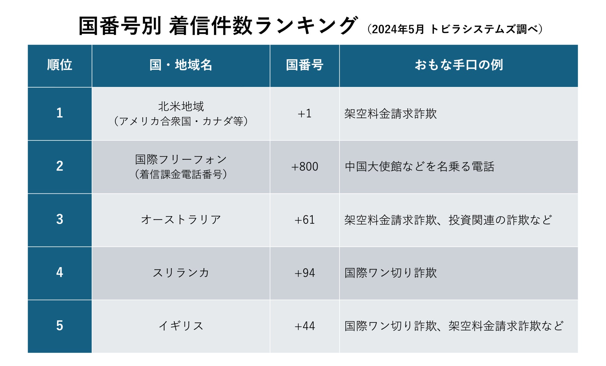 当社の調査で、2024年5月に着信件数が多かった国際電話の国番号は、上位からアメリカ合衆国やカナダなどの北米地域、国際フリーフォン、オーストラリア、スリランカ、イギリスでした。