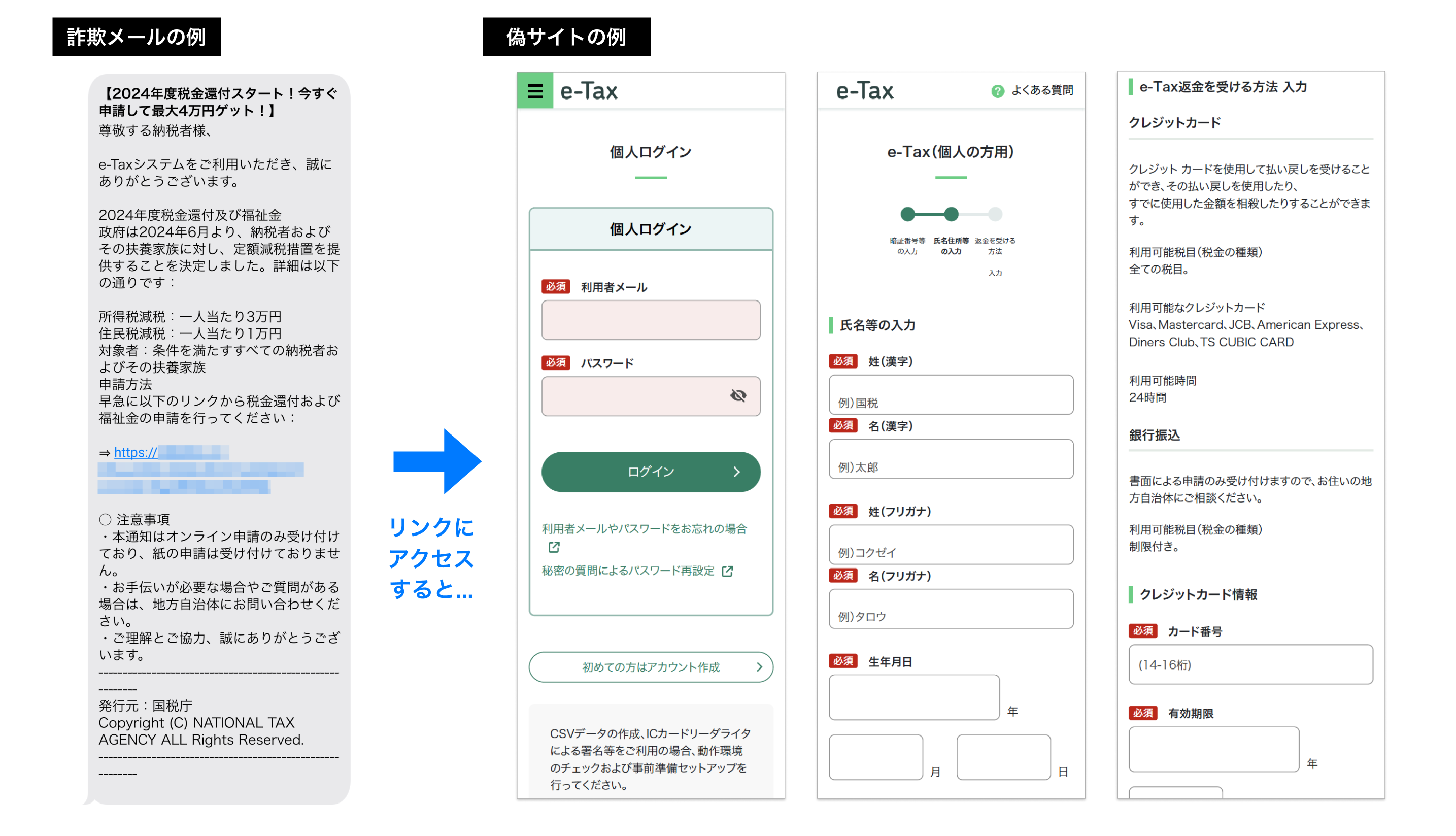 トビラシステムズの調査では、6月下旬ごろ、定額減税に便乗したフィッシング詐欺の手口が確認されました。「早急に税金還付の申請を行ってください」「オンライン申請のみ受け付けています」などと、虚偽の情報を記載したメールから、個人情報やクレジットカード情報の入力を求めるフィッシングサイト(偽サイト)に誘導し、情報を盗み取ろうとする手口です。