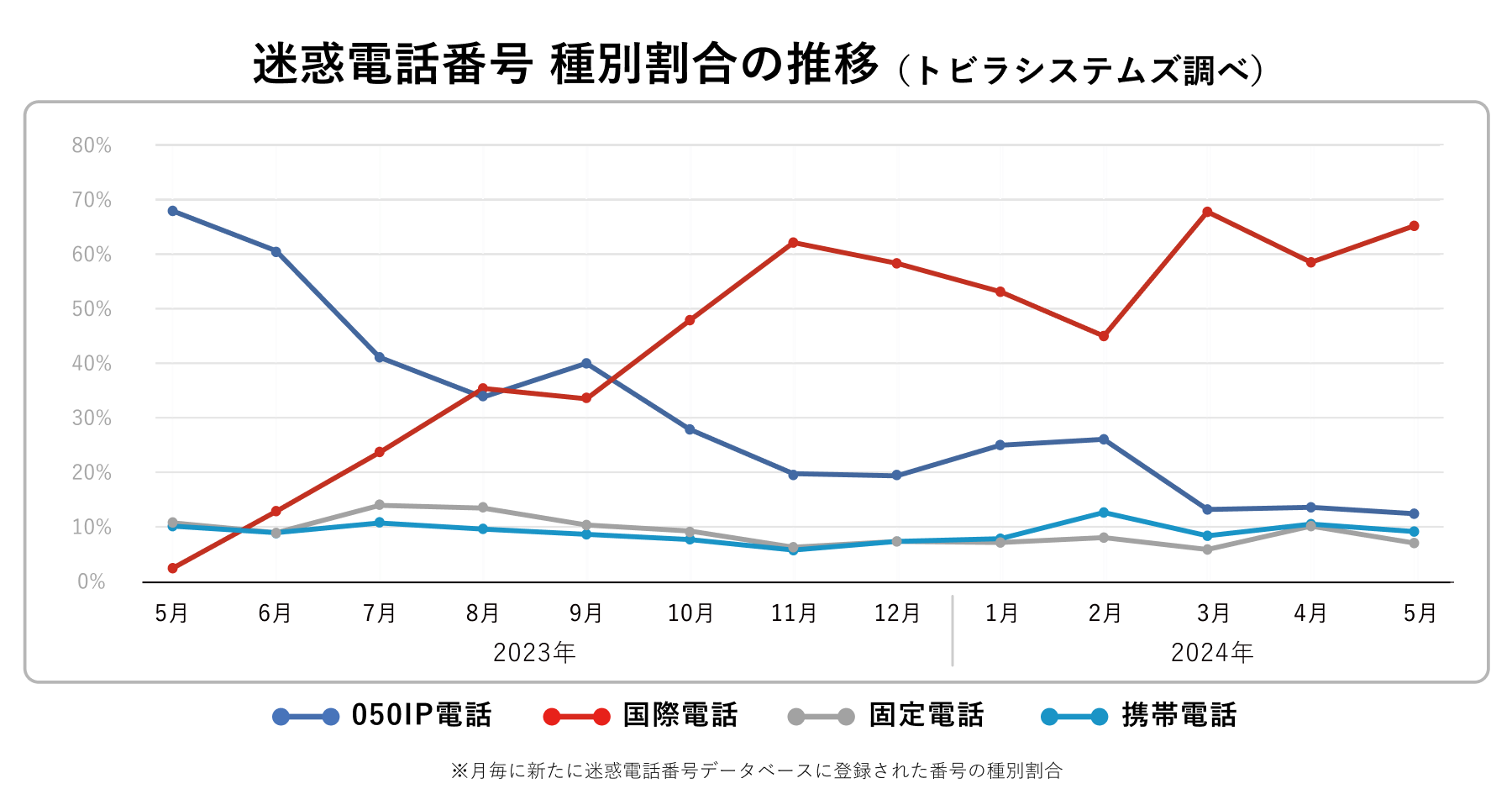 2024年5月に新たにトビラシステムズの迷惑電話番号データベースに登録された番号の種別割合について、国際電話番号は65.2%(前月比+6.8%)となりました。