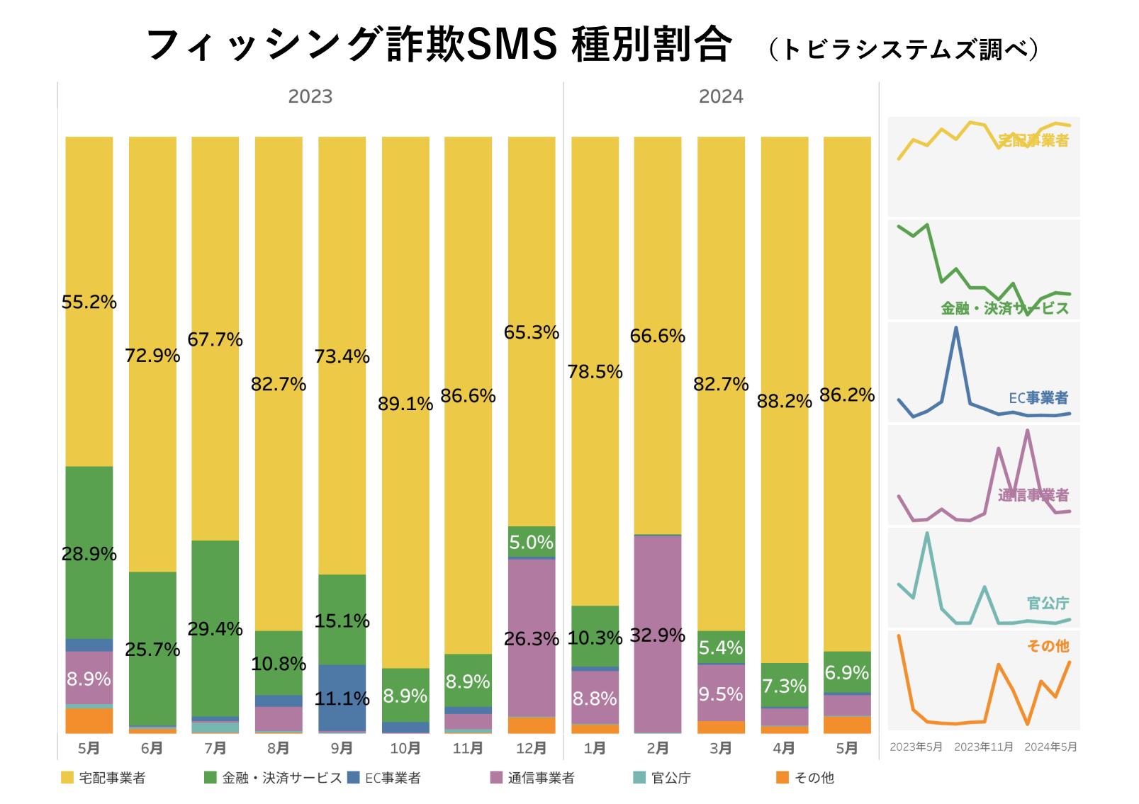 トビラシステムズの調査で、2024年5月に確認されたフィッシング詐欺のSMSの種別割合は、宅配事業者をかたる手口が86.2%を占めました。次いで金融・決済サービスをかたる手口が6.9%、通信事業者をかたる手口が3.3%となりました。