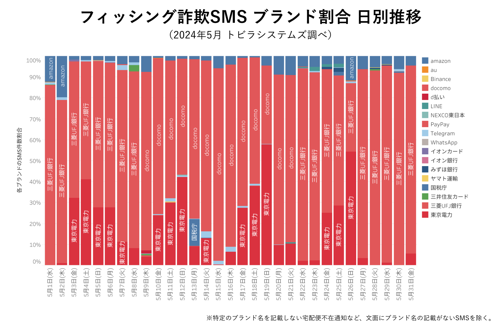 実在する企業やブランドの名前をかたる詐欺SMSについて、2024年5月は「三菱UFJ銀行」「docomo」「東京電力」をかたるものが特に目立ちました。生活インフラとして身近な企業やブランドの名前をかたる詐欺SMSに引き続き注意が必要です。