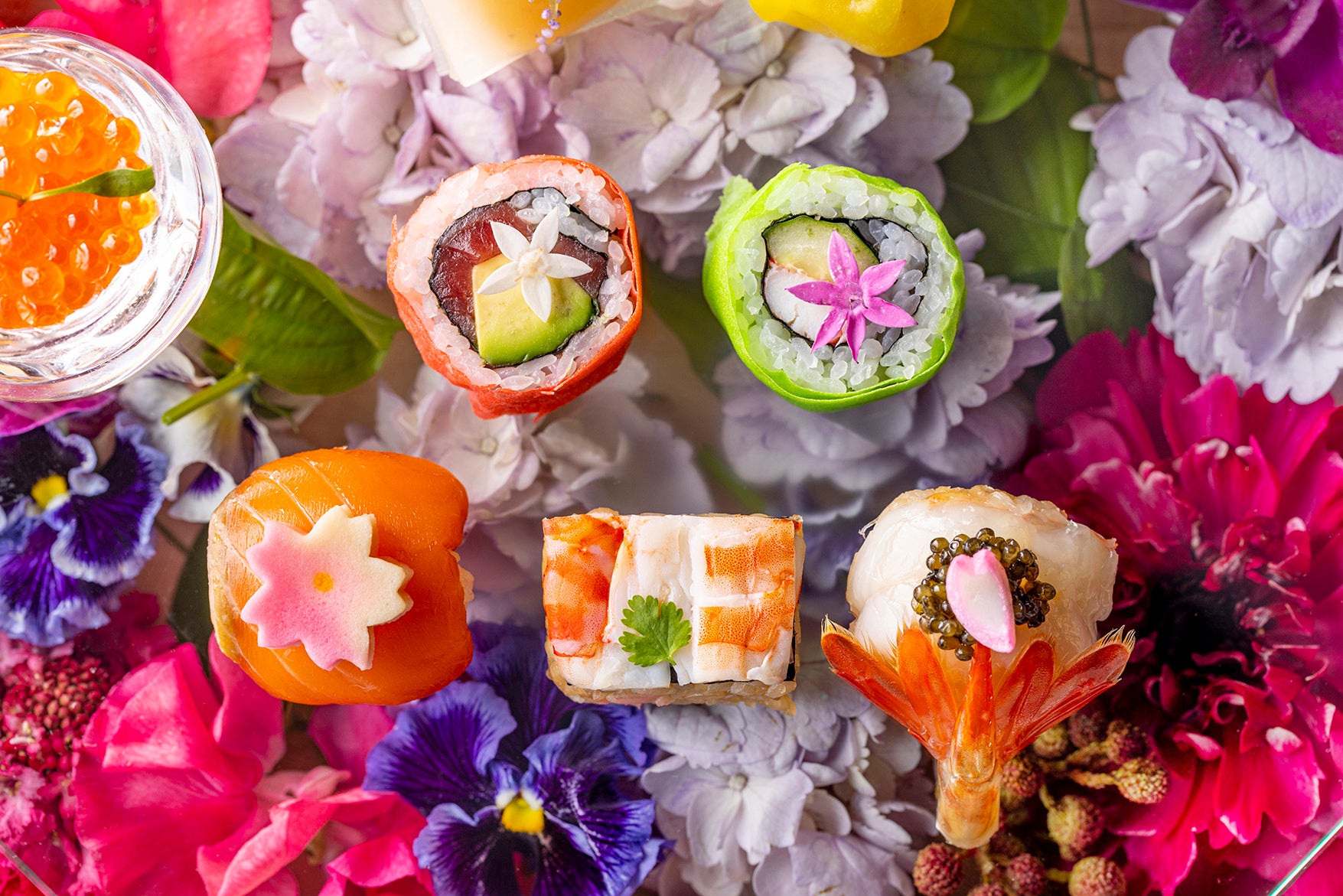 メニュー:先付け、お造り(2種)、桜鯛の道明寺蒸し、彩り寿司『海老圧し寿司、ミニいくら寿司、手毬寿司(2種)、巻き寿司(2種)』、赤出汁、日替わり和スイーツ(3種)、ヒルトン東京オリジナル花煎茶