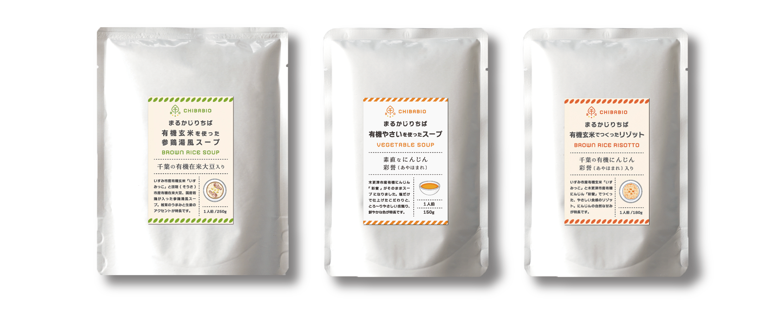 また、ちばだんが展開する、~千葉の誇りにかけて素材にまっすぐ~をコンセプトにかかげた千葉産ローカル&オーガニックブランド「CHIBABIO-ちばびお」より、取り組みの第一弾として、千葉県の食材を堪能できる千葉県の有機野菜を使ったスープ、有機玄米を使ったリゾットとスープ、あわせて3商品を共同開発しました。2022年4月23日(土)にオープンする「無印良品 イオンタウン旭」での販売を皮切りに、千葉県内の無印良品および石井食品にて順次販売を開始いたします。