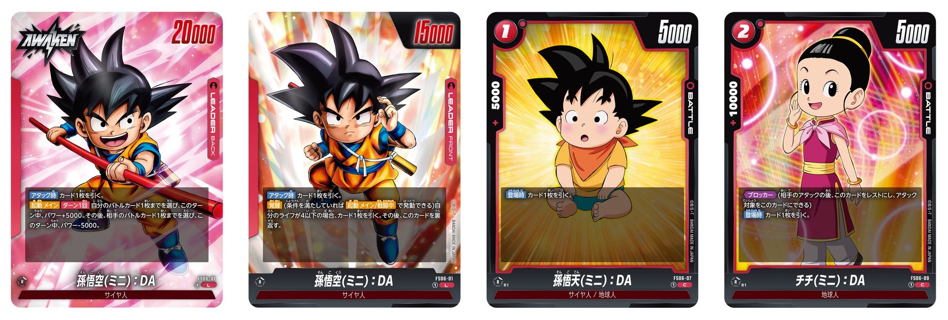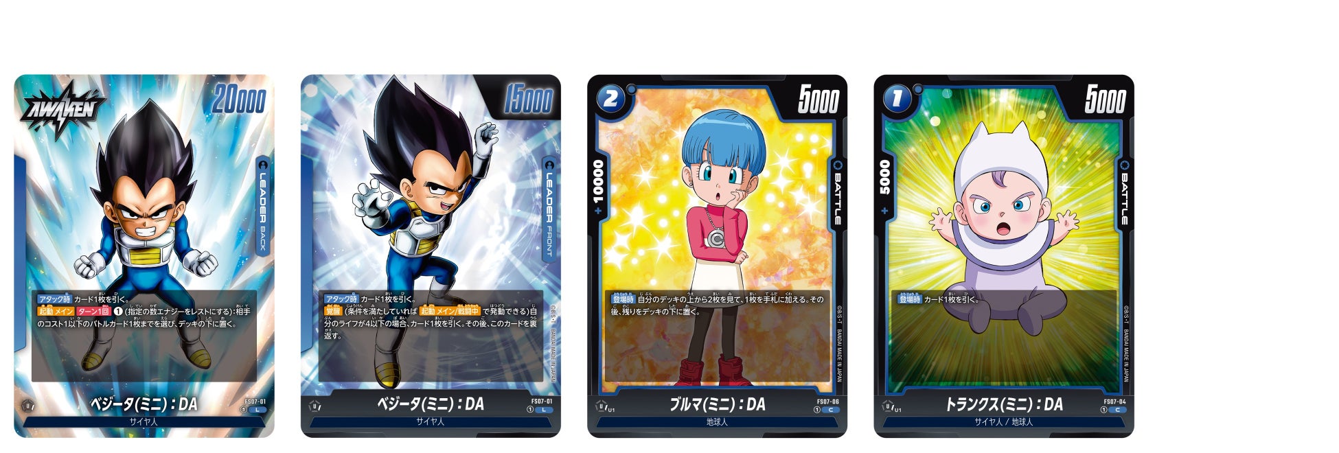 また、10月11日(金)より放送開始予定の完全新作アニメシリーズ『ドラゴンボールDAIMA』に登場するキャラクターたちをラインナップした構築済みデッキ、『スタートデッキ 孫悟空(ミニ)[FS06]』と『スタートデッキ ベジータ(ミニ)[FS07]』が全国のカードショップや家電量販店等で11月8日(金)に発売開始します。