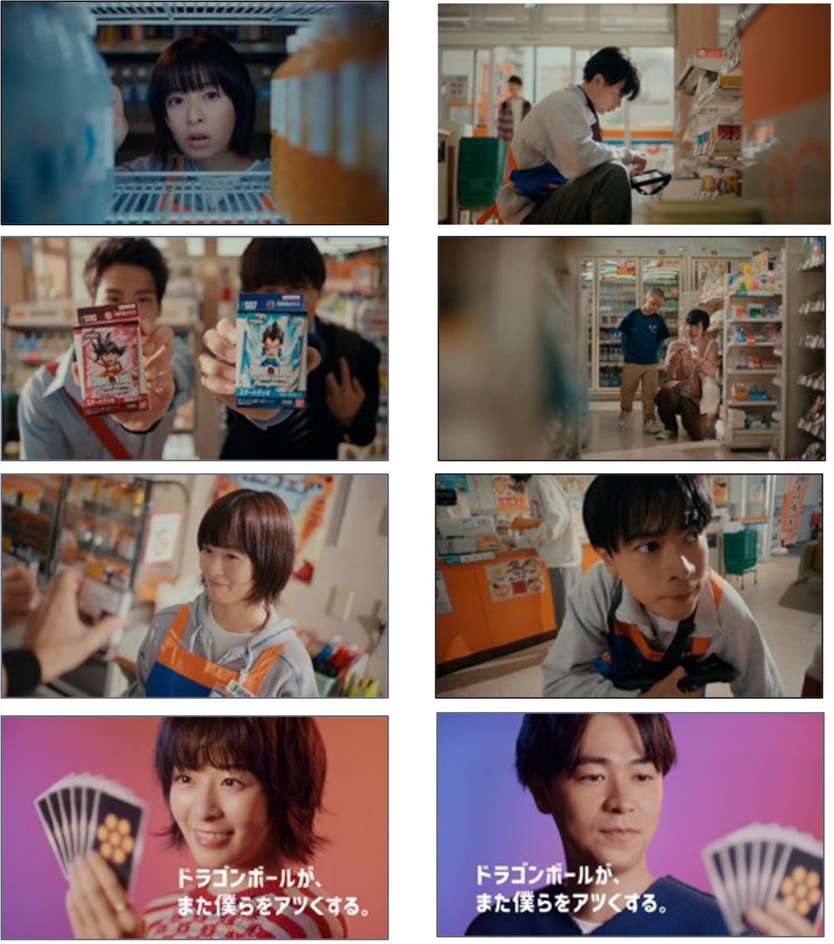 今回のTVCMでは、本商品のCMシリーズに3度目の登場となる俳優の成田凌さんと森七菜さんのお二人が再び出演します。今回お二人はコンビニの店員に扮し、『ドラゴンボールスーパーカードゲーム フュージョンワールド』を手に取ってアツくなる青年たちや親子をそれぞれの視点で切り取ります。