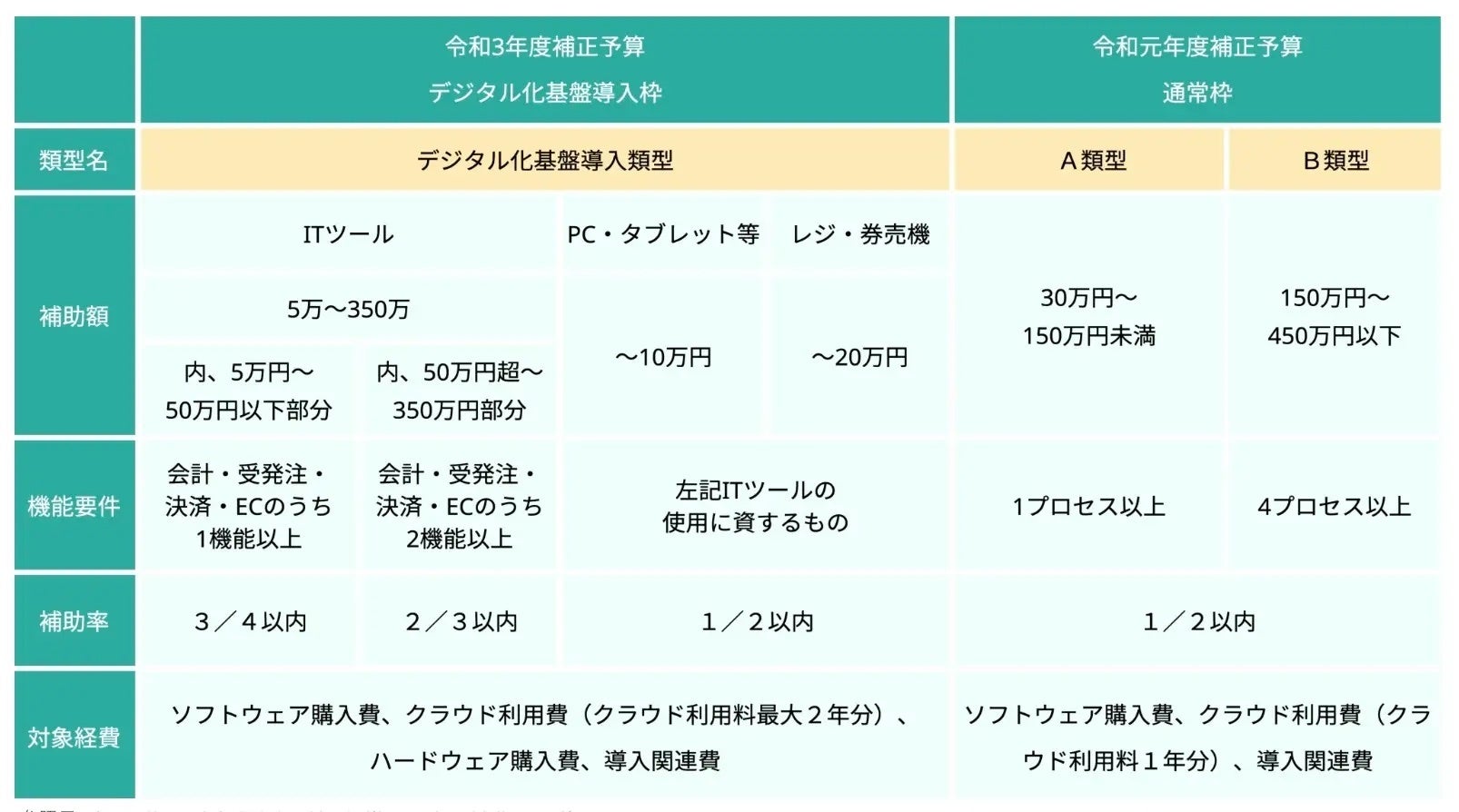 「通常枠(A・B類型)」と「デジタル化基盤導入枠(デジタル化基盤導入類型)」や「複数社連携型IT導入枠」があります。