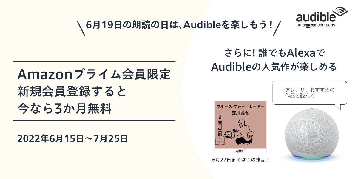 Amazonオーディブル (以下、オーディブル) では、6月19日(日)の「朗読の日」に際して、朗読作品をより多くの方に楽しんでいただくためのキャンペーンを実施します。2022年6月15日(水)~7月25日(月)までの間、Amazonプライム会員のお客様は、Audible又は Amazonサイトからオーディブル会員プランに新規登録すると、オーディブルを3か月間無料でお楽しみいただくことができます。また本日より、誰でもオーディブルのおすすめ作品がAmazon Alexaにて楽しめるキャンペーンも始まります。
