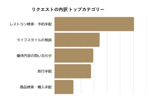 コンシェルジュへのリクエストの中でも、最も多く寄せられているのが「レストランの検索・予約手配」です。特に、「2名様のご予約で1名様分のコース料金が無料」となる「ラグジュアリーダイニング by LC」の特別優待は、コンシェルジュ経由でお手配が可能なことから、多くの会員様にご好評いただき、リクエスト数の増加につながっています。