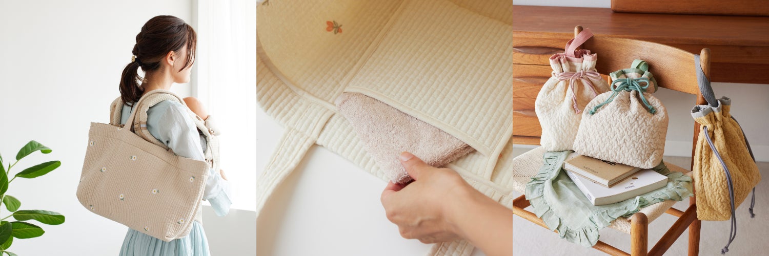 ふんわり軽いヌビ(キルティング)を使用した大容量のトートバッグ。大人が肩掛けきる長さの持ち手で、荷物が多い乳児さんの通園に最適です。ヌビの生まれ故郷の韓国でも実績のある専門工場だから叶う、光沢のある立体的な刺繍、細部まで丁寧な縫製がポイント。大人のコーディネートに馴染んで毎日使いやすい、上質なバッグです。合わせて使いたいお着替え入れにぴったりな巾着バッグもご用意しております。