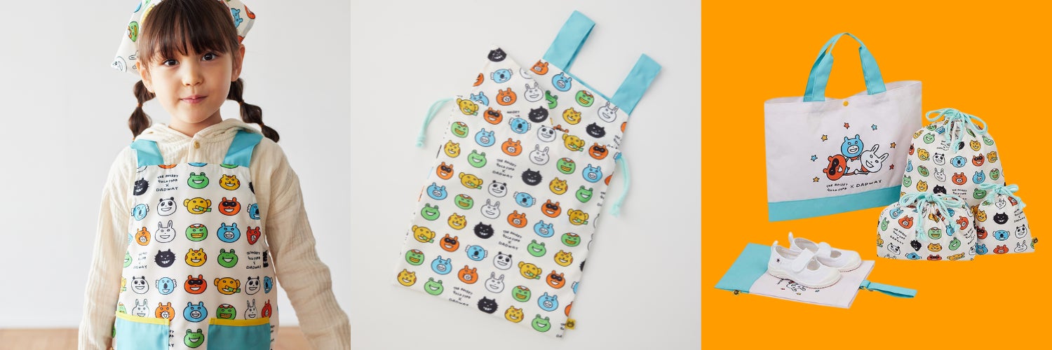 イラストレーターTHE ROCKET GOLD STARとのコラボレーションアイテム。笑顔がチャーミングなキャラクターと、ポップな色使いが魅力です。クッキングや工作などの作業時に着用するキッズエプロンは、ずれにくい太い肩ひもで着心地にもこだわりました。お子さまが自分で被りやすいゴム仕様の三角巾付き。お揃いで使いたいスクールバッグやコップも展開しています。