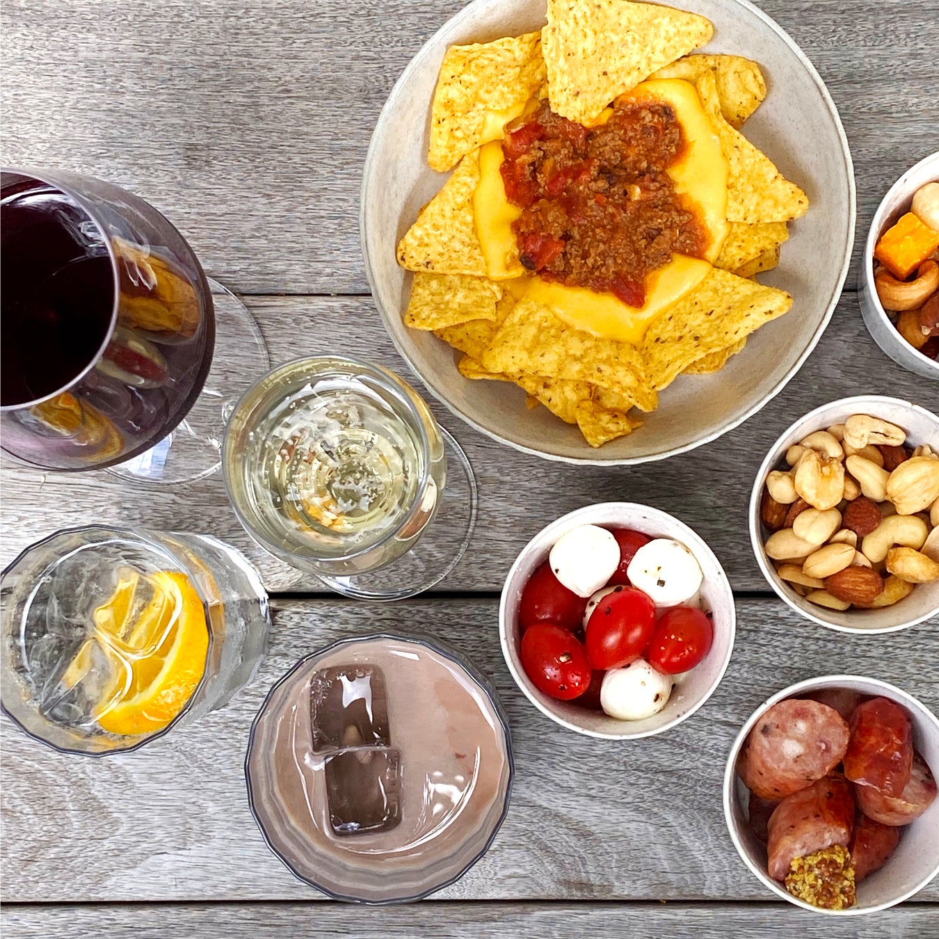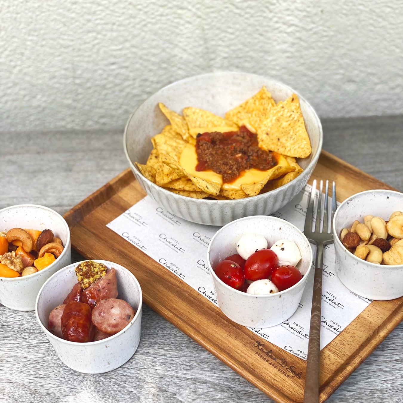フードメニューは、ナチョスやソーセージの温かいおつまみの他、ナッツやチーズなどのスナック類をご用意。同一価格で10種の中からチョコレートを4個もお選びいただけるメニューも。