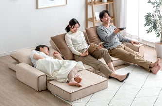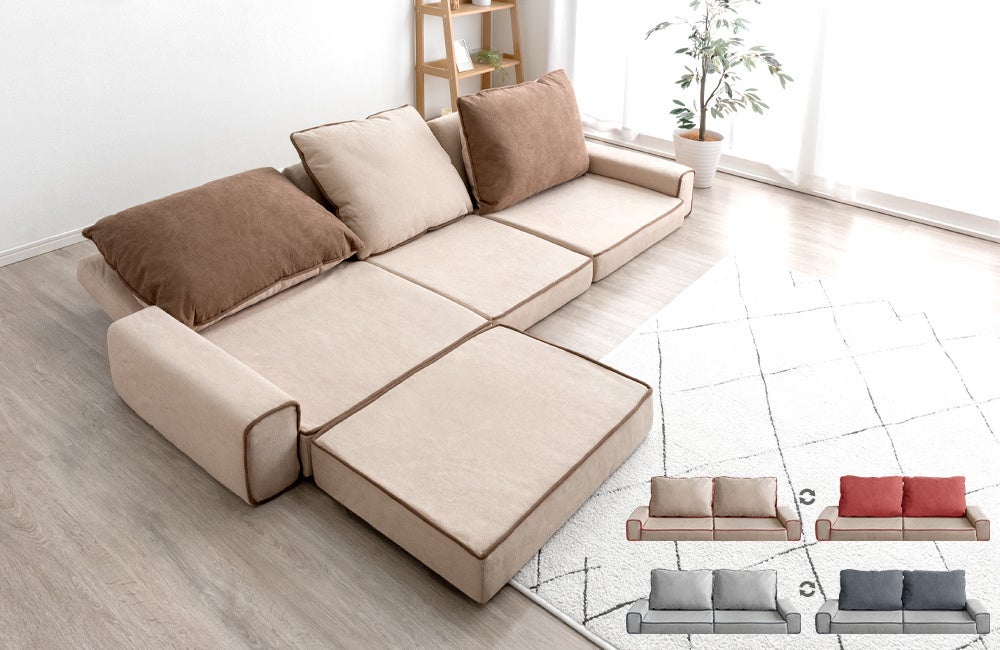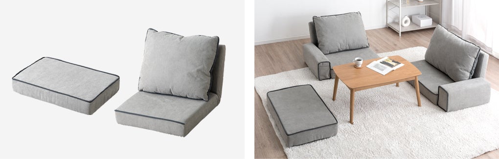 タンスのゲンよりリバーシブルクッションで気軽にイメージチェンジできるフロアソファを新発売1Pソファとオットマンの追加パーツを組み合わせてお部屋に合わせた理想のレイアウトが可能に!