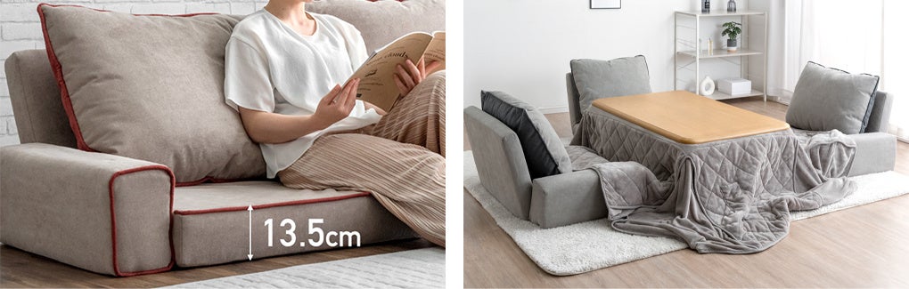 (※画像左:座面高13.5cmで圧迫感なく設置可能 / 画像右:こたつやローテーブルと相性抜群)
