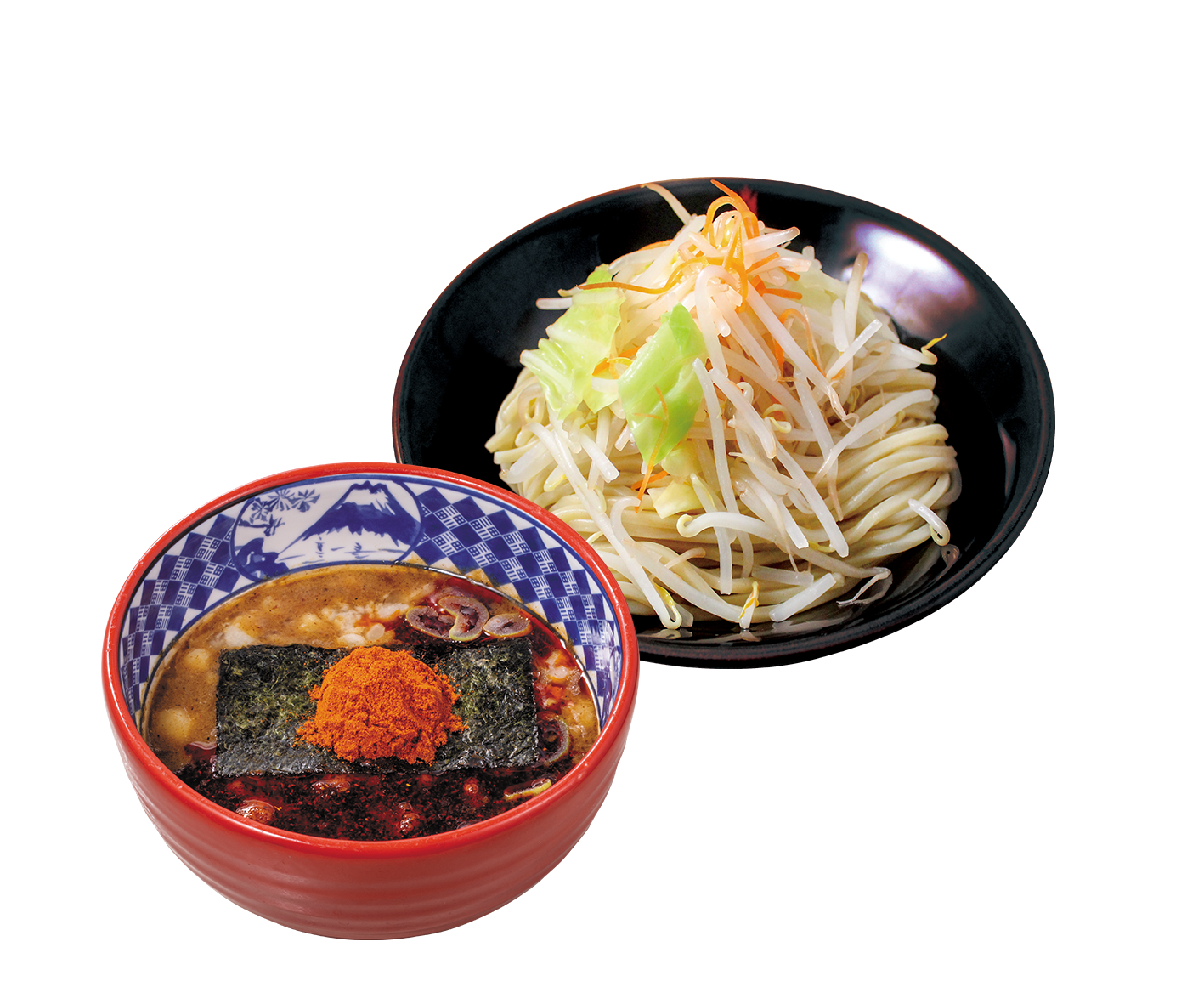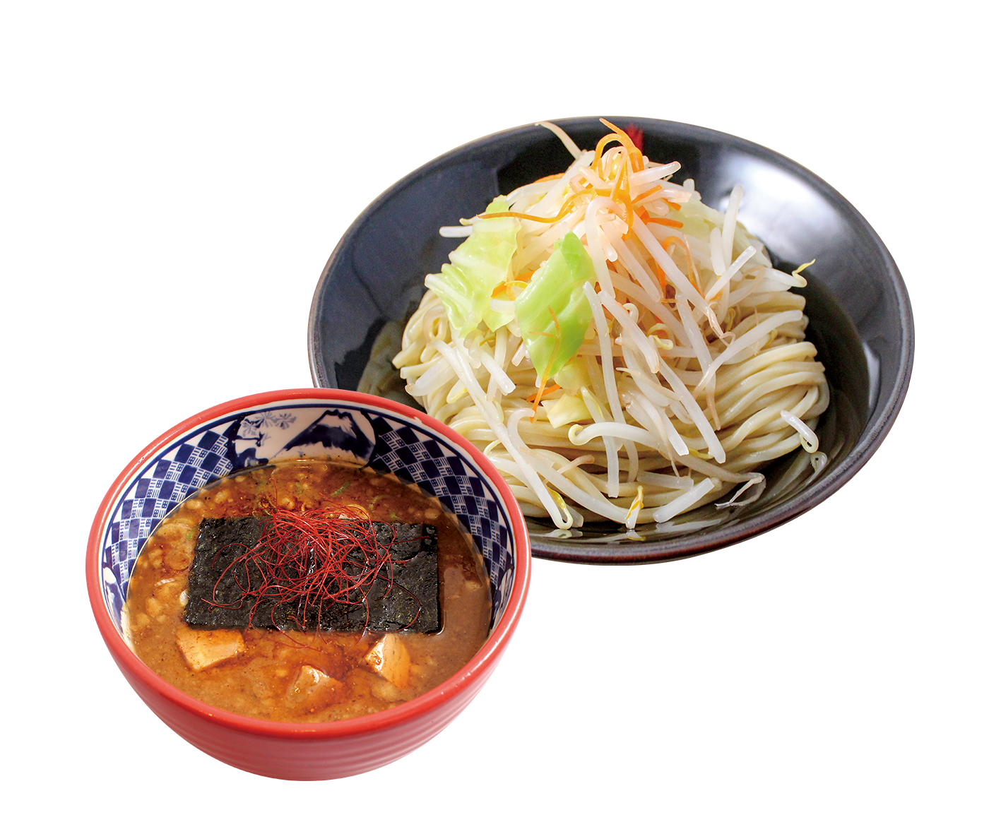 こってり濃厚な豚骨魚介&味噌スープに、たっぷりの野菜と別添えのおろしニンニク・ショウガが嬉しい一杯。最後の一口までアツアツでお召し上がり頂ける”あつもり”の麺が大変オススメです。特製ラー油をかけたピリ辛の『赤味噌つけ麺』も提供。