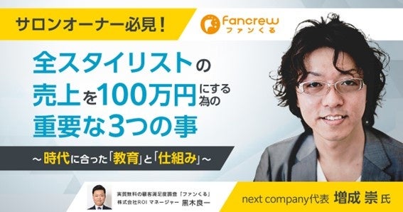 国内最大級の顧客満足度向上プラットフォーム「ファンくる」を運営する株式会ROI(本社:東京都千代田区、代表取締役社長:山口敬人)は株式会社next company(本社:大阪府東大阪市、代表取締役:増成崇)の増成代表をお迎えし、「全スタイリストの売上を100万円にする為の重要な3つの事~時代に合った「教育」と「仕組み」~」 (無料)を9月27日(火)に開催いたします。(申し込み先: https://biz.fancrew.jp/seminar_contact6?=pr1)