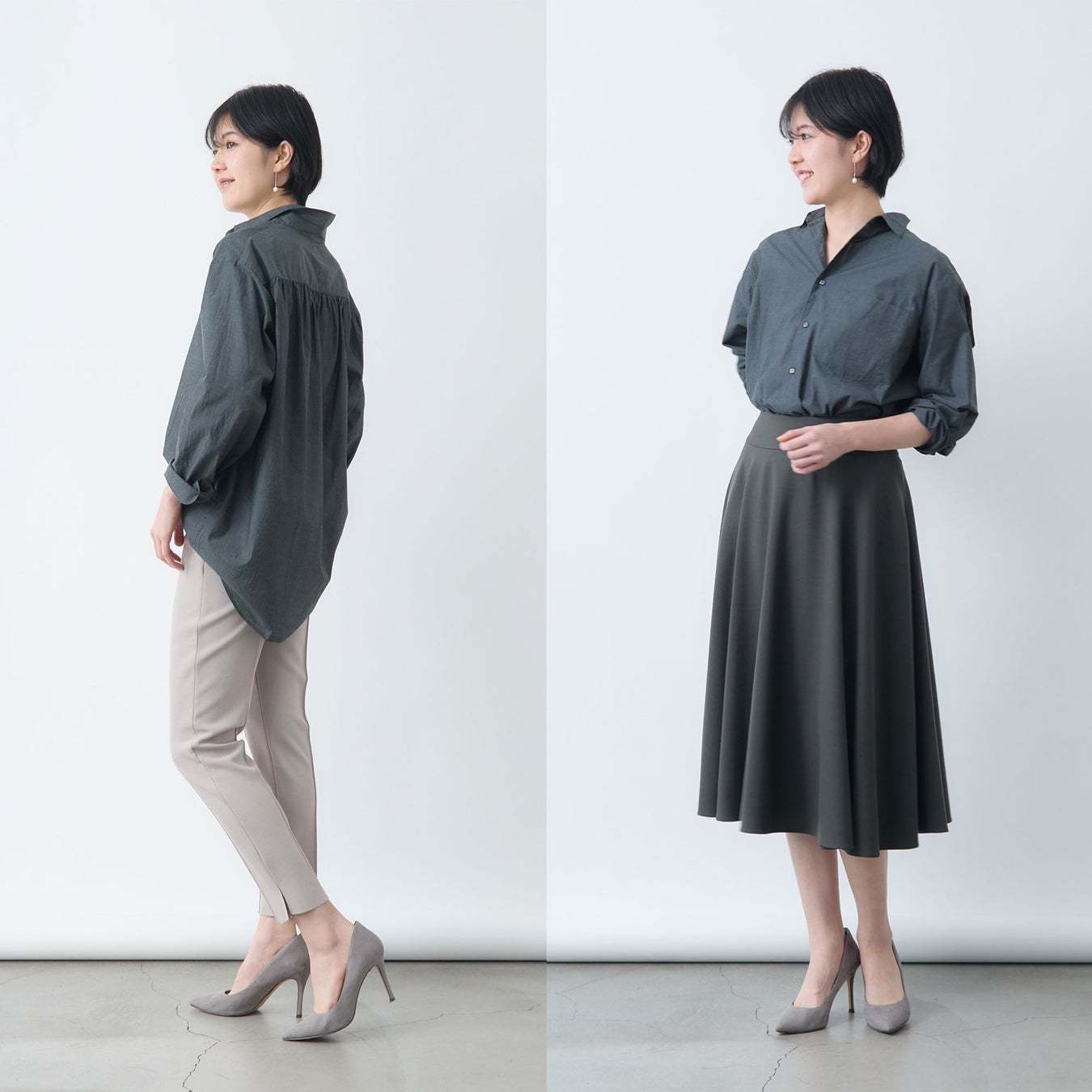 シワが目立ちにくいという特徴に加え、「シワがあってもきれいに見える」という点にフォーカスを当てて開発された生地は、写真のように洗いざらしでもOK。きちんと感を楽しみたい時はアイロンをかけていただくと、また違った表情になります。