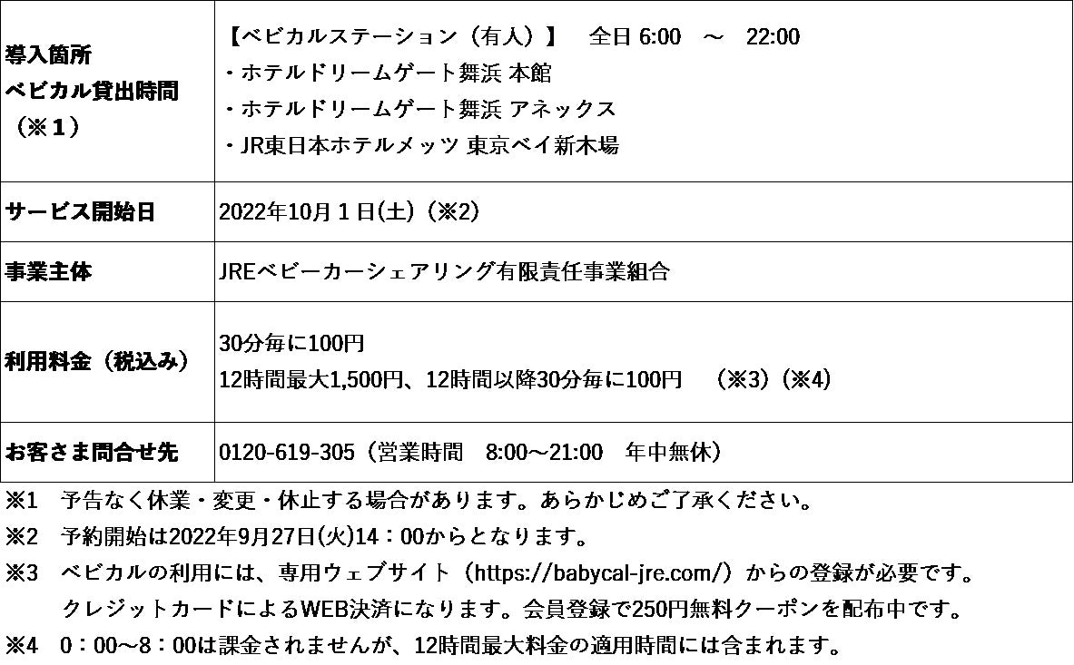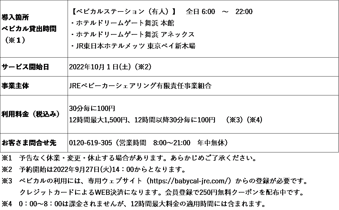 ◆今回、日本ホテル株式会社(JR東日本グループ)が運営するホテル「ホテルドリームゲート舞浜 本館」、「ホテルドリームゲート舞浜 アネックス」、「JR東日本ホテルメッツ 東京ベイ新木場」でサービスを開始します。ベビカルの開始により、子育て世帯の快適なおでかけやご旅行をサポートいたします。