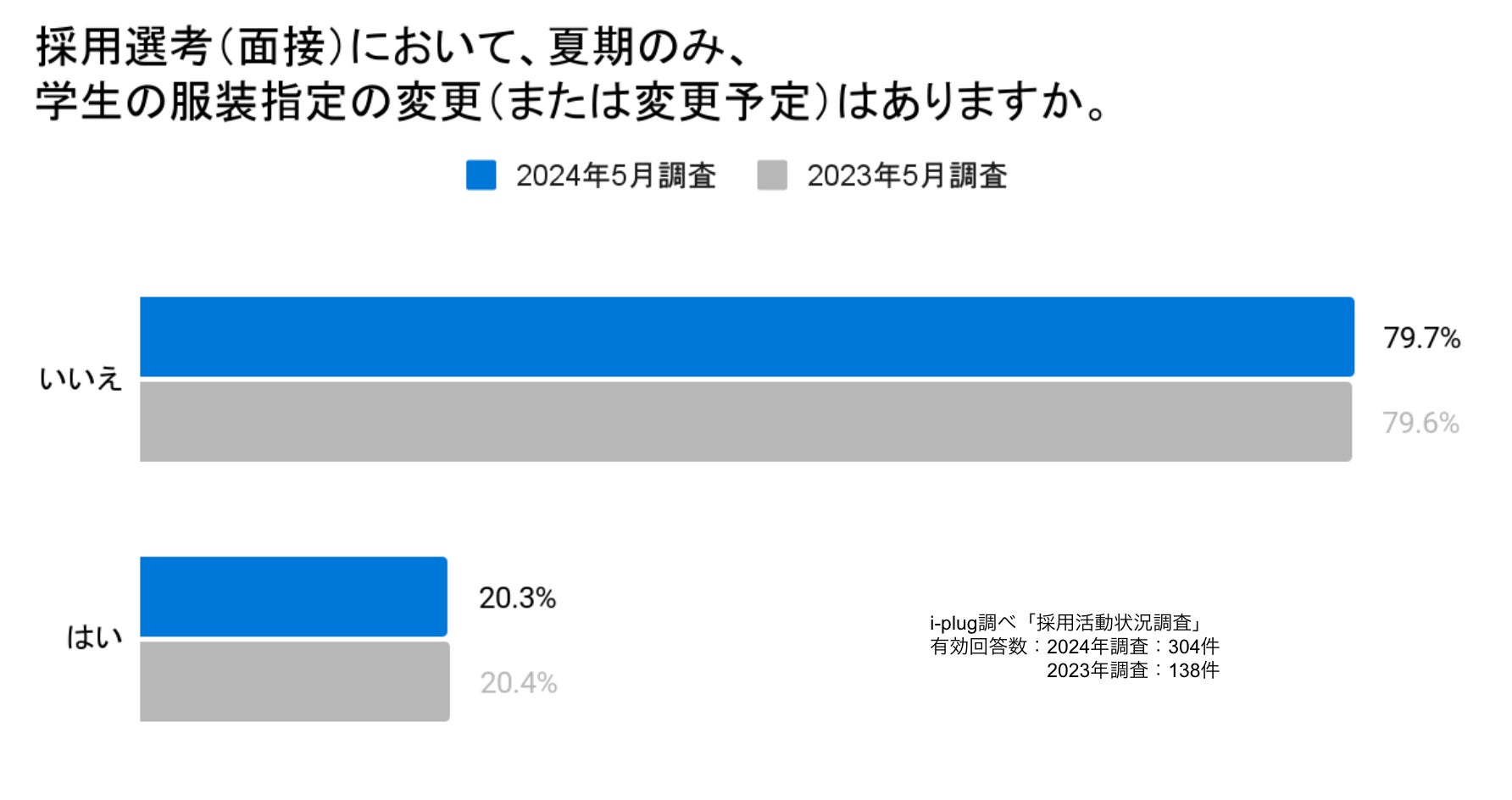 採用選考(面接)において、「スーツ」または「ジャケット着用」を指定する企業に夏期の学生の服装指定の変更(または変更予定)について伺ったところ、79.7%が「いいえ」と回答しました。