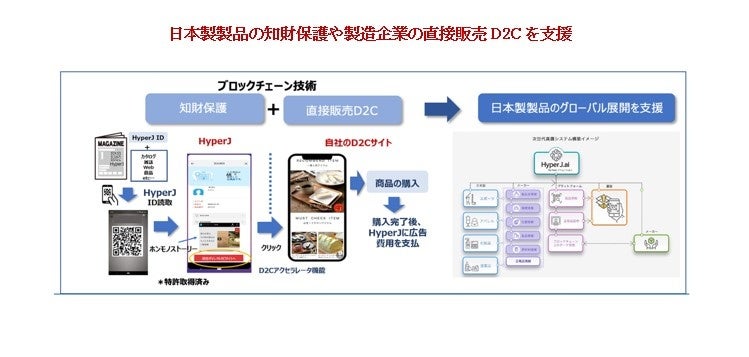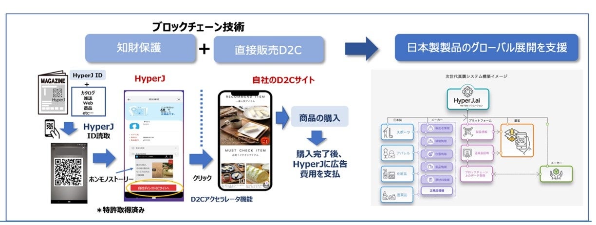HyperJ.ai は、最先端のブロックチェーン技術と独自のアルゴリズムにより、模倣品をなくし「日本製」かつ「本物」であることを証明することができる真贋判定システムであり、日本製品を偽造品や模倣品から守る目的で開発されました。スマホでQRコードやNFCを読み取ることで、製品の真正性や品質が確認でき、消費者は安心して日本製品を購入することができます。さらに、真贋判定と同じ画面上で、生産者の思いを動画で配信できる「ホンモノストーリー」動画を通じて、製品やサービスをアピールできるだけでなく、D2Cアクセラレーター機能により直接商品の購入もできる仕組みとなっています。